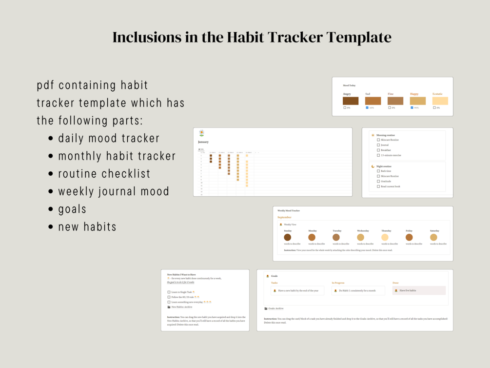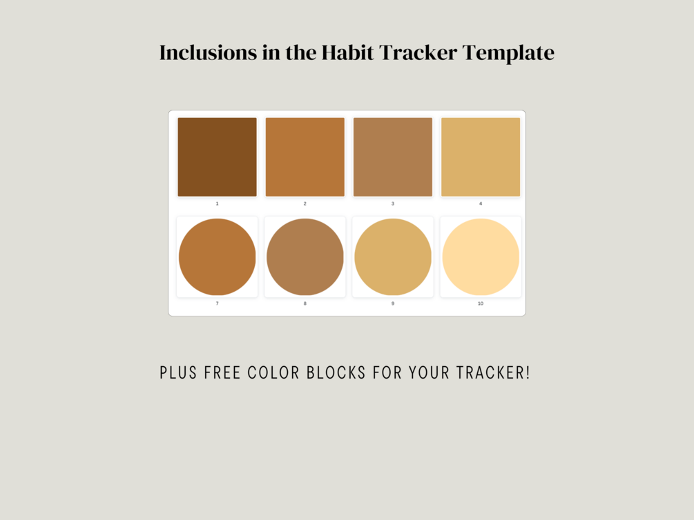 Once you purchase this, you will get a zip file of the color blocks and a pdf containing the link of the Notion Habit Tracker Template containing the following:
