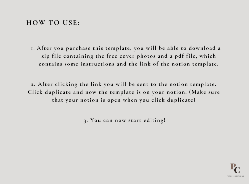 Once you purchase this, you will get a zip file containing the free notion covers and a pdf containing the link of the Notion Template.