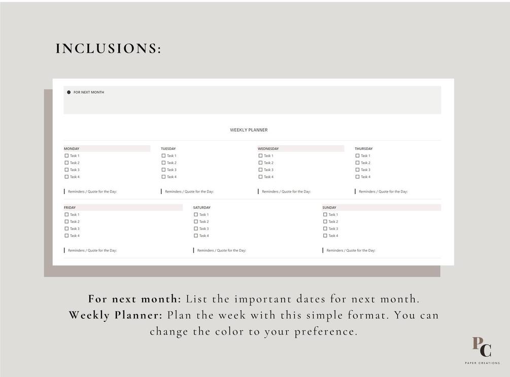 The first part of the template is where you can list all your tasks within the month. Below that, there is a section for important dates and events within the next months. The middle section is the weekly planner where you can manage your tasks within the week. The last part is for your goals and how you plan to achieve them.